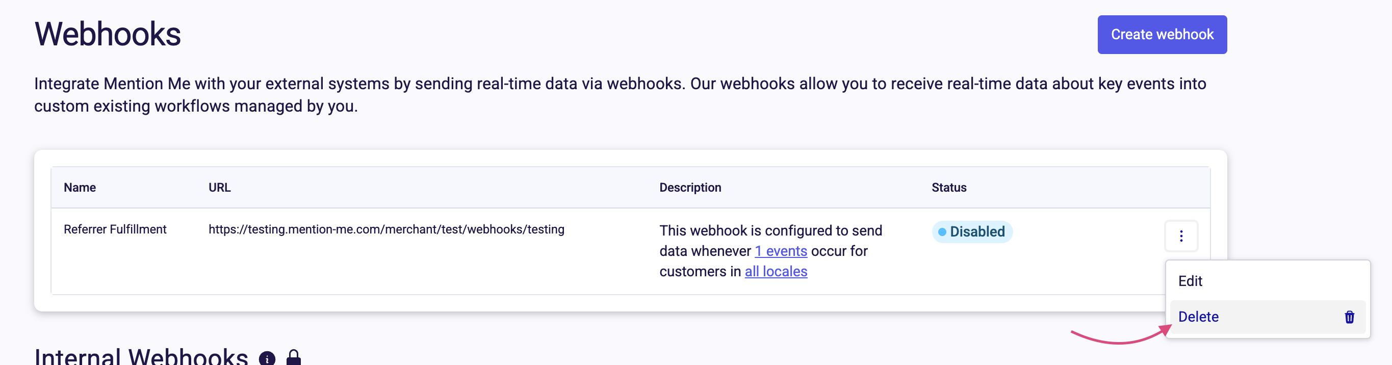 From the Webhooks dashboard, locate the webhook you’d like to delete.