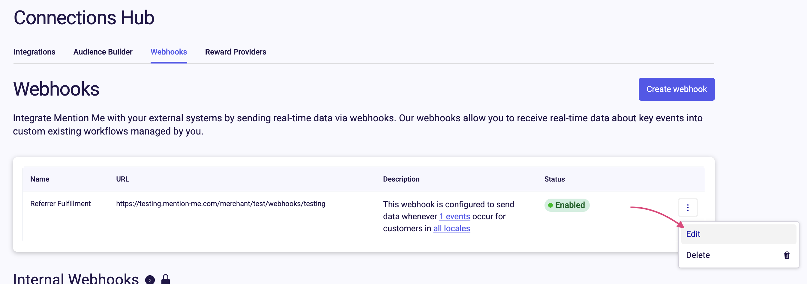 Find the webhook you want to update. Click the ⋮ menu, then choose Edit.